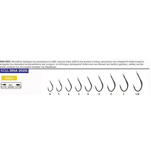 SNA202 gold . Σίγουρο και μοναδικό άρπαγμα σε κάθε τεχνική όπως καθετή και φυσικά ντύσιμο αγκιστριών για τσαπαρί ! Η πεπλατυσμένη κούρμπα του προκαλεί αντανακλάσεις και ενισχύει το στέλεχος ασύγκριτα! Ανθεκτικό και ιδανικό για πολλές χρήσεις, καθώς και βασικός κωδικός για τα γνωστά τσαπαρί της Hayabusa!