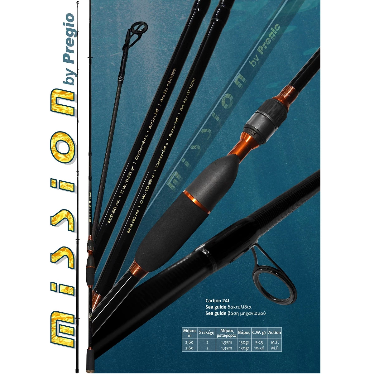 Η Pregio δεν σταματάει να προσφέρει στον ψαρά, καινοτόμα προϊόντα σε τιμές ιδιαίτερα φιλικές! Το Mission έχει την «αποστολή» να εξοπλίσει τον ψαρά που ασχολείται με το spinning με ένα καλάμι ιδανικό για κάθε ψάρι και κάθε τεχνητό δόλωμα. Πρόκειται για «βασικά» καλάμια, ιδανικά για ψάρεμα σε λιμάνι, βράχια και παραλία, με ποικιλία τεχνητών δολωμάτων όπως minnows, top waters, σιλικόνες και άλλα πολλά. Με δράση Medium – Fast καταφέρνει να «συγχωράει» τυχόν λάθη του ψαρά και να καταλήγει πάντα το ψάρι στην απόχη μας, καθώς και την χρήση πιο Light εξοπλισμού. Η νέα σειρά Mission κρίνεται ιδανική για ψάρεμα λαβρακιού, λούτσου, και άλλων ψαριών.