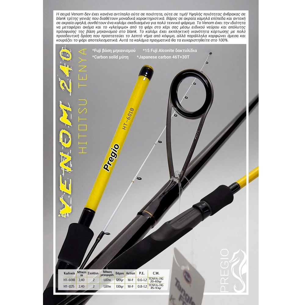 Υψηλής ποιότητας άνθρακας σε blank τρίτης γενιάς που διαθέτουν μοναδικά χαρακτηριστικά. Η σειρά Venom είναι ένα σκαλί πιο πάνω από την Passion και δεν έχει κανένα αντίπαλο ! Βάρος σε ακραία χαμηλά επίπεδα και αντοχή σε ακραία υψηλά, συνθέτουν ένα καλάμι σχεδιασμένο για πολύ τεχνικό ψάρεμα. Το Venom έχει την ιδιότητα να μεταφέρει ακόμα και το «γλείψιμο» από τα ψάρι στο χέρι σας μέσο ειδικού νεύρου και απόλυτης πρόσφυσης της βάση μηχανισμού στο blank. Το καλάμι έχει εκπληκτική ικανότητα κύρτωσης με πολύ προοδευτική δράση που προστατεύει το λεπτό νήμα από κόψιμο, αλλά παράλληλα καρφώνει άμεσα και κουράζει το ψάρι αποτελεσματικά. Αυτά τα καλάμια πραγματικά θα τα ευχαριστηθείτε στο 100%.