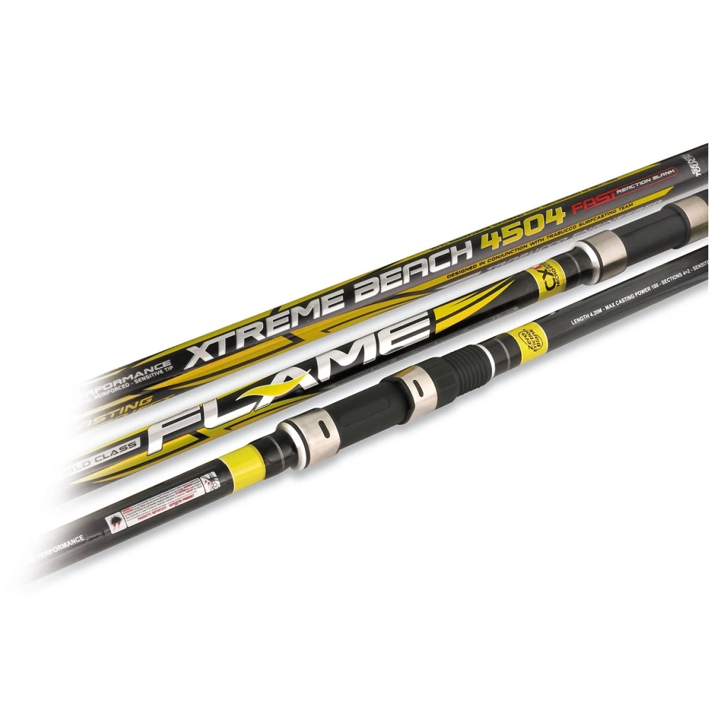 Καλάμι TRABUCCO Flame Xtreme Beach 4.50m τηλεσκοπικό με 2 πρώτα στελέχη για beach ledgering. To ένα στέλεχος έχει από 20 έως 50g casting weight (light action) και το άλλο από 50 εως 100g casting weight (heavy action).