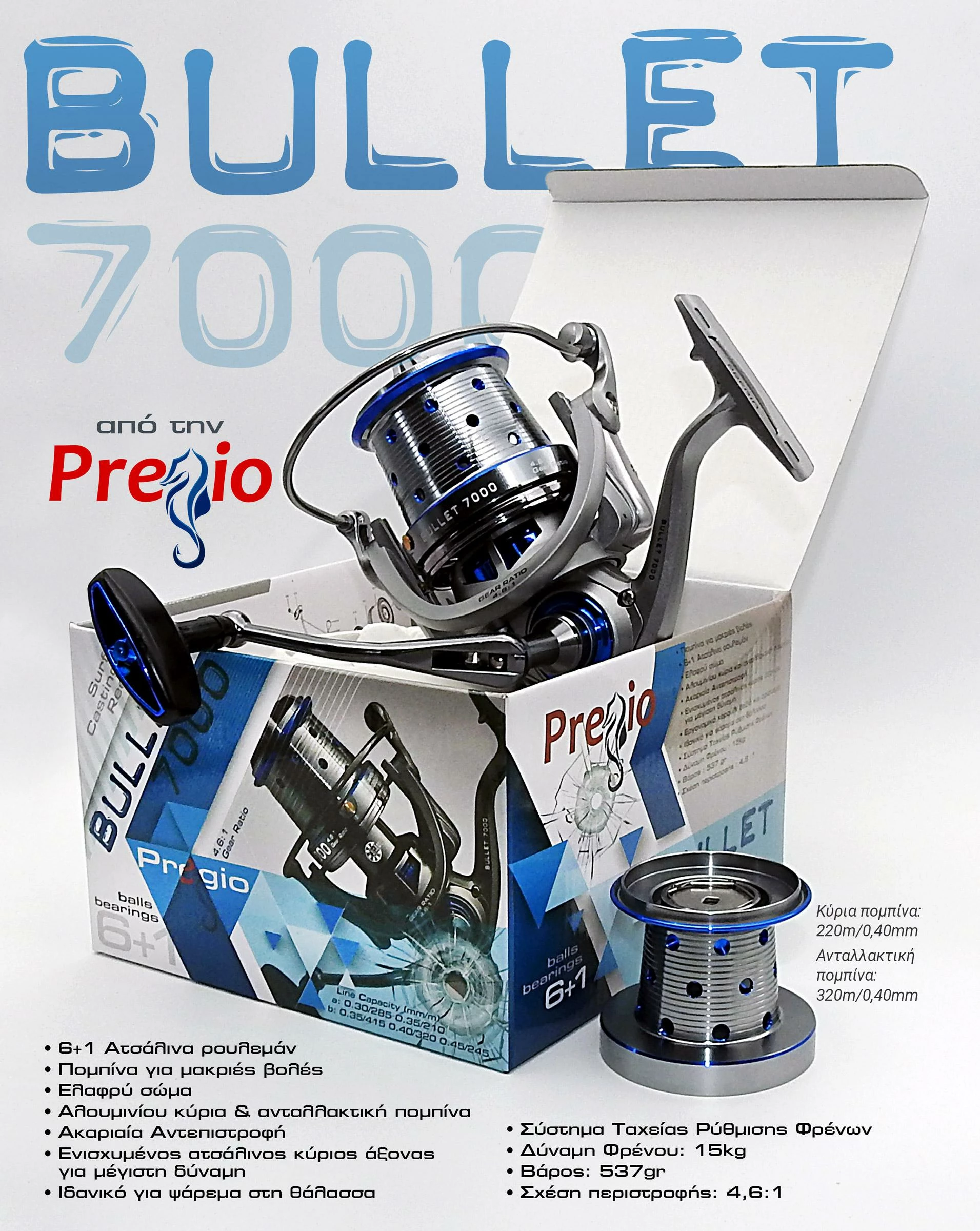 PREGIO Surf Casting . Στημένος στις αρχές του αγαπημένου σας sniper, o bullet καταφέρνει να είναι εξίσου σκληροτράχηλος με ακόμα μικρότερο βάρος! Πρόκειται για ένα μηχανισμό σχεδιασμένο στη κόψη της τεχνολογίας, με ασύλληπτη βολή, άψογη διαχείριση πετονιάς και φρένα με τεχνολογία quick drag που όχι μόνο αποδίδουν 15 κιλά αντίστασης, αλλά θα δουλέψουν άκρως γραμμικά και στα πιο λεπτά παράμαλλα! Ο Bullet συνοδεύεται από δυο αλουμινίου μπομπίνες διαφορετικής χωρητικότητας για να καλύψει και τον πιο απαιτητικό Surf Caster!